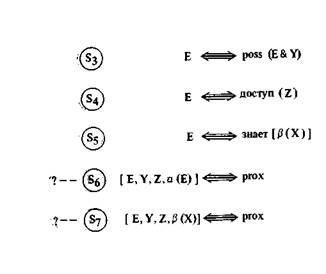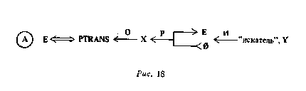 В ходе такого построения мы широко использовали аппарат концептуально-зависимостного (КЗ) анализа Роджера Шенка [26]. Он играет существенную роль в построении надежного концептуального фундамента на уровне подробностей устройства событий. В отличие от Шейка, однако, мы в большей степени сосредоточиваемся на отношениях между КЗ-структурами, нежели на внутреннем представлении этих последних. В результате наша нотация иногда расходится с шенковской — в основном скорее из соображений удобства, чем в силу теоретических разногласий. Например, репрезентируя обладание деятелем F знания, скажем, о нахождении объекта X в месте β, мы для краткости используем простой предикат с атрибутом «знает», а то, что известно, сокращается в содержимое скобок: