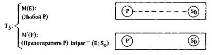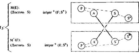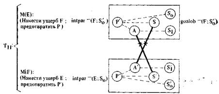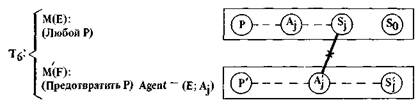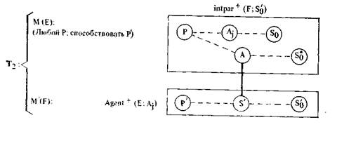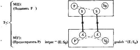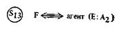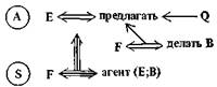 Здесь необходимо пояснить нотацию. Кружки с буквой, а при необходимости и с индексами внутри обозначают S -атомы (аналогично обозначались А-атомы выше и будут обозначаться P -атомы ниже). Двусторонняя тройная стрелка — это шенковс-кая нотация для «нахождения в определенном состоянии». Сокращение «poss (X)» используется вместо «обладать Х-ом». Наконец, термин «агент» используется в нашей системе специальным образом. Когда F принимает предложение Е выполнить действие В, он становится агентом Е (в отношении действия В). В условиях двустороннего общественного договора обе стороны вступают в отношения, делающие их агентами друг друга3.