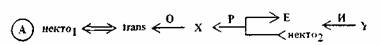 (Заключительная стрелка указывает на то, что при перемещении может оказаться необходимым инструмент Y. Некто1 и не-кто2 — неспецифицированные деятели: соответственно, тот, кто осуществляет перемещение, и тот, кто первоначально обладал Х-ом.)