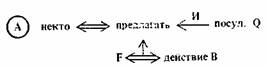 1. Атомы действия (А-атомы). А-атом (action 'действие') образуется любой концептуальной зависимостью, в состав которой входит связь «деятель—действие», обозначаемая двойной двусторонней стрелкой; А-атом может также включать в себя необходимый для спецификации действия набор концептуальных падежей— в их число входят Объектный (О), Инструментальный (И), Директивный (Д) и Рецептивный (Р) падежи. Этими средствами задается, но терминологии Шенка, «главная линия» концептуальной зависимости. Использования атрибутивных падежей, выражающих отношения обладания, дислокации и содержания (чего-либо в чем-либо), вообще говоря, не требуется; не используются при построении атомов и каузальные отношения.