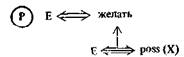 3. Атомы замысла (Р-атомы). Р-атомы (purpose зд. 'замысел')* образуются из действия «желать» некоторого деятеля путем указания желаемого состояния. (В качестве желаемого состояния могут выступать любые конструкции, являющиеся S -атомами, хотя в составе Р-атома эти конструкции описывают скорее предполагаемый будущий результат, чем действительные состояния.) Так, например, мы можем записать: