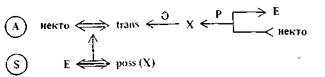 Будем говорить, что А- и S -атомы связаны, если А-атом находится в каузальном отношении к описываемому S -атомом состоянию. Определить сущность каузального отношения нелегко, по скольку оно зависит от содержания той или иной концептуализации (выражения на языке концептуальных зависимостей). Скольнибудь глубокий анализ каузации не входит в данной главе в наши планы, однако мы приведем некоторые типичные примеры Простейшим случаем является тавтологическая каузация: Е получил от кого-то объект X и в силу этого обладает им: