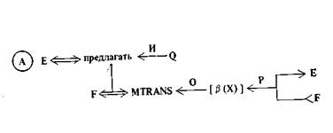 Очень важен в нашей схеме А-атом, репрезентирующий предложение деятеля Е другому деятелю F выполнить действие В, соответствующее замыслам Е. В общем случае это предложение подкрепляется социальными или несоциальными стимулами или угрозами, которые мы в дальнейшем обозначаем как «посул» («offer») Q.