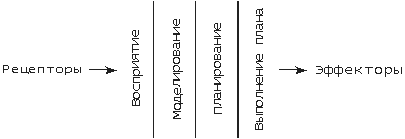 Можно заметить, что все это, за исключением разве что потребностей, вполне укладывается в пример архитектуры Брукса представленный на рис. 2. Почему же важно отделять поисковое поведение от рефлекторного? Это объясняется тем, что работа данных механизмов и условия их применения существенно отличны. Действительно, случайный поиск оправдан в условиях неопределенности необходимой реакции, в то время как рефлекс однозначно определяет реакцию. Рефлекторное поведение характеризуется высокой скоростью и автоматизмом. От опознания ситуации до реакции здесь всего один шаг. Поиск напротив допускает наличие многих шагов с момента возникновения потребности до начала ее удовлетворения. Наконец, отделение поискового поведения от рефлекторного дает объяснение некоторым феноменам наблюдаемым нами в психической деятельности такого несравненно более сложного механизма как человеческий мозг.