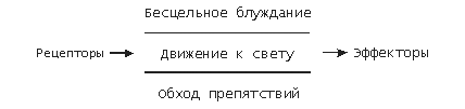 Для того чтобы показать первичность механизма поиска по отношению ко всем другим функциям, осуществляемым интеллектом, представим минимальную модель автономной системы, животного. Определения жизни, даваемые Медниковым или Шредингером, избыточны для нас еще и потому, что мы рассматриваем лишь интересующее нас в связи с интеллектом подмножество живого. Ключевым моментом является то, что живые организмы не только нуждаются для своего существования в некотором ресурсе или условиях, т.е. имеют потребности, но и обладают механизмами для их самостоятельного удовлетворения. Очевидно, что наша модель животного должна иметь, по крайней мере, рецепторы потребностей (рецепторы нарушения условий существования) и эффекторы. Особый интерес естественно представляет способ связи рецепторов с эффекторами. Здесь, в силу широкой известности учения Павлова, исследователи склонны сразу переходить к схеме рефлекса как простейшему способу такой связи. Что, однако, произойдет, если всякий раз при возникновении потребности и все время пока она не начнет удовлетворяться, система будет генерировать случайные реакции? Представим себе гусеничного робота имеющего пару двигателей, аккумулятор и солнечную батарею для подзарядки последнего. Робот обладает также единственным рецептором потребности, который сигнализирует о разрядке/зарядке аккумулятора, сообщая, таким образом, о “неудовольствии” (неудовлетворенности потребности) или “удовольствии” – начале и процессе ее удовлетворения. Первое сообщение активизирует генератор случайной реакции, а второе подавляет его активность. В результате при некоторой величине разряда аккумулятора робот (представим, что он “живет” в помещении, по полу которого медленно и случайно передвигается пятно света) активизируется и начинает хаотически двигаться до тех пор, пока не попадет в это пятно, и рецептор потребности не сообщит о том, что зарядка аккумулятора началась. Здесь робот деактивируется и продолжает оставаться на месте до следующего разряда аккумулятора. Т.к. за это время пятно света “уходит”, процесс поиска при следующей разрядке аккумулятора начинается сначала. Очевидно, что никакой рефлекс при данной простейшей конструкции робота не может обеспечить ему продолжение активного существования. А вот генератор случайной реакции в связке с рецептором потребности, совокупность которых образует механизм поиска, теоретически может.