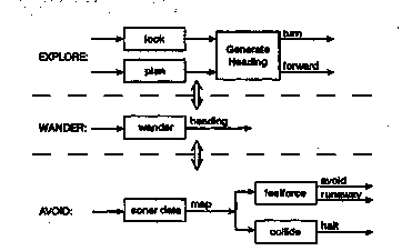 Эта сеть конечных автоматов самого низкого уровня генерирует инструкции halt (остановиться) и avoid (обойти) для всей системы. Следующий слой WANDER (перемещение) определяет способ перемещения системы, генерируя для робота случайное направление каждые 10 секунд. Автомат (нижний уровень) получает направление heading от автомата WANDER и связывает его с результатами работы уровня AVOID. Автомат WANDER использует этот результат для подавления поведения более низкого уровня, заставляя робота двигаться в направлении, близком к заданному, и в то же время избегать столкновения со всеми препятствиями. И, наконец, активизируясь, автоматы turn (повернуть) и forward (прямо) (на верхнем уровне архитектуры) будут подавлять любые новые импульсы, присланные от автомата WANDER.