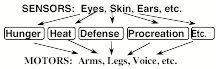 The simplest version of such a scheme would be almost the same as an “If-Then” machine of the kind described in §1-4. There, each “If” detects a certain real-world problem, which causes the system then to react with a certain pre-specified, real-world action. So the behaviors of simple If-Then machines are highly constrained and inflexible.