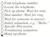 First, you must find the phone and dial a number. Then, once the connection has been established, you're supposed to begin with some pleasantries. Eventually, you should say why you called—and then depart from the typical script. At the end you'll close the conversation by saying “goodbye” and ‘hanging up’. Generally, such behavioral scripts begin and end with conventional steps, with improvisations in between. However, you’ll have to depart from the script if something goes wrong—and know how to deal with a wrong connection, or what to do if there is no answer, or if you hear the whine of a modem—or if there is too much noise on the line.