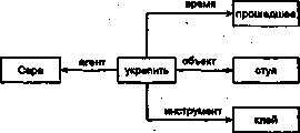 В [Simmons, 1973] подчеркнута необходимость стандартизации отношений с учетом грамматики английского языка. В этом подходе, основанном на работе [Fillmore, 1968], связи определяются ролью существительных и групп существительных в действии, описываемом предложением. К числу возможных ролей (падежных отношений) относятся агент, объект, инструмент, место и время. Йредложенйе представляется как набор узлов, один из которых соответствует глаго-лу, а остальные связанные с ним узлы представляют других участников действия. Эта структура называется падежным фреймом (case frame). При разборе предложения программа находит глагол и ищет в базе знаний соответствующий ему падежный фрейм. Затем она связывает значения агента, объекта и тому подобного с соответствующими узлами падежного фрейма. Используя этот подход, предложение "Sarah fixed the chair with glue" ("Сара укрепила стул клеем") можно представить сетью, показанной на рис. 6.5.